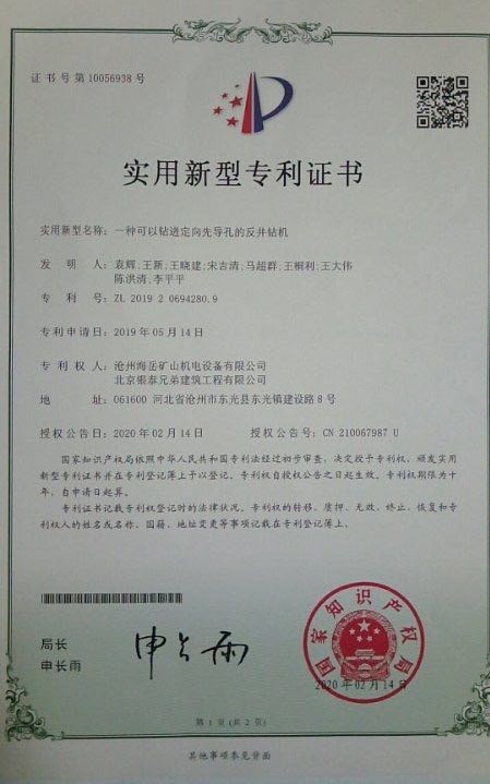 我公司用于先导孔定向施工的反井钻机获得国家专利