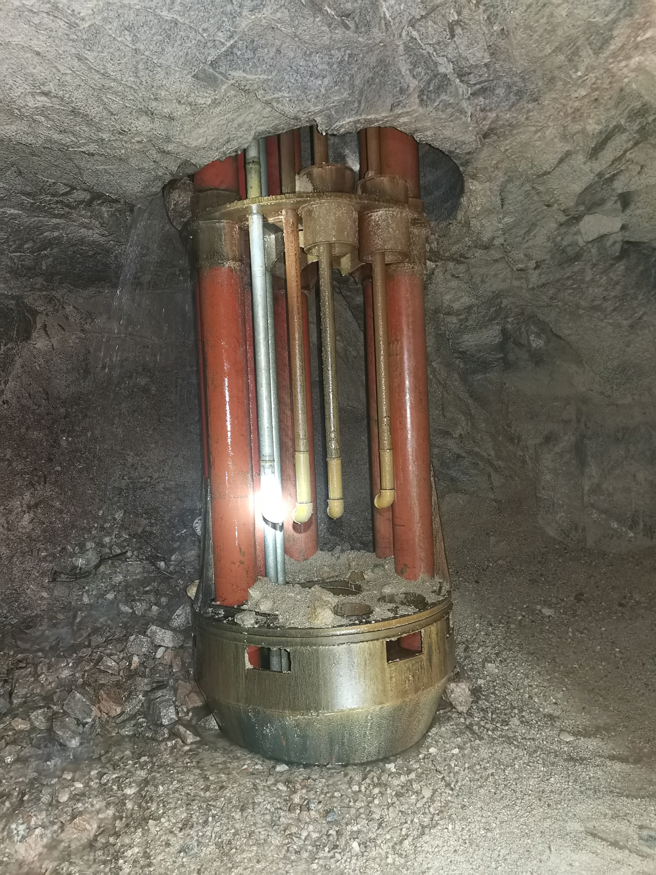 充填井内安装2根∅50镀锌油管和8根充填管,8根充填管中的2根充填管下放到-380m中段,其他管路下放到-556m中段,充填管采用∅159钢管8根,管子外壁厚10毫米,内壁后4毫米,每米管子重49.5公斤,其中5根约650m,3根510m,加上连接结构件,总重超过300吨;该工程的难度主要在管路的安装和下放,采用我公司研制的600吨下管装置,该工程得以顺利实施。该工程的完成,标志着充填井一个新工法的诞生。